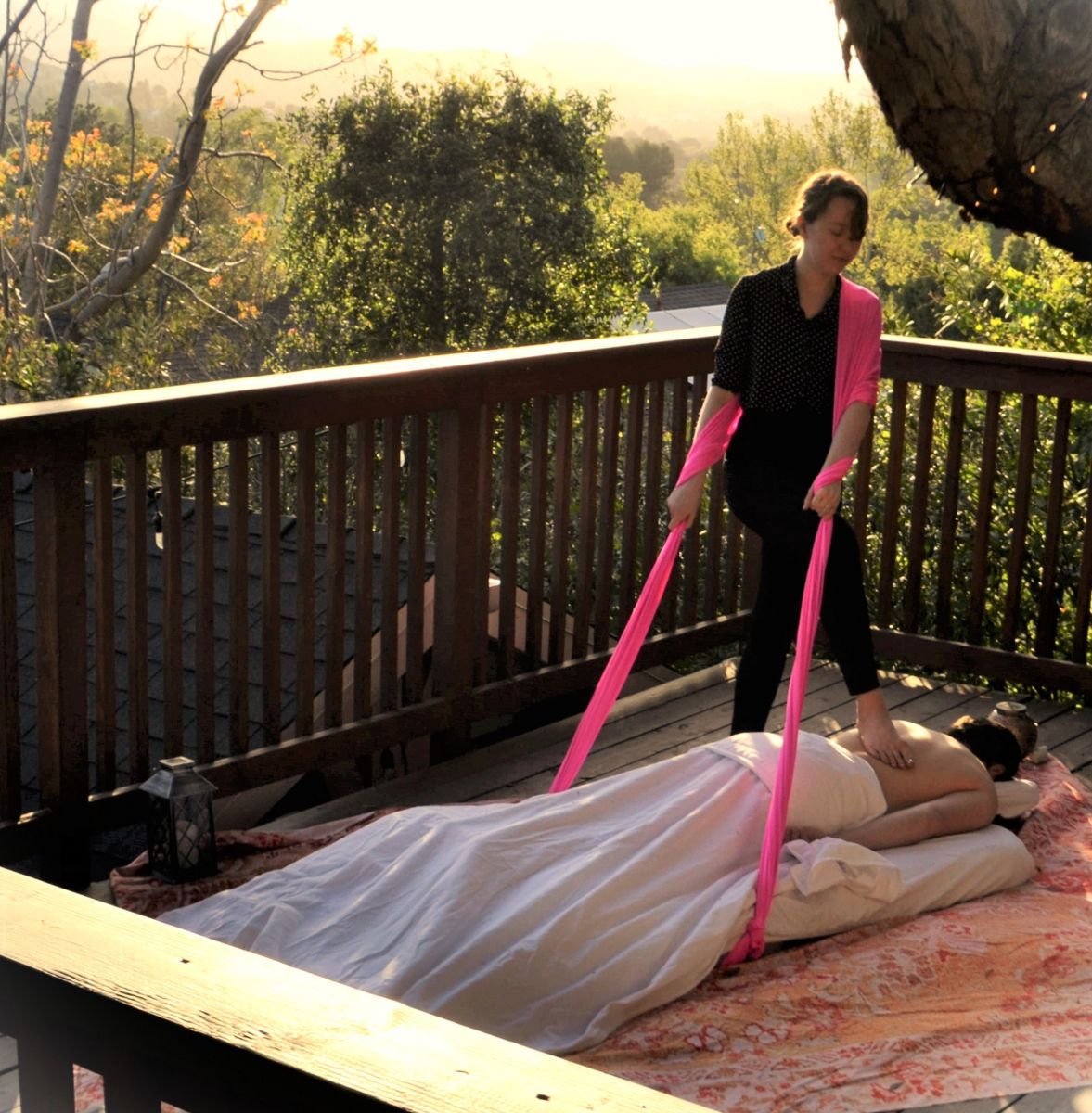 Sarga Bodywork marries method & design, enabling practitioners to gain tensional support and force with a fabric strap fastened to a massage table. By pulling up on the fabric while applying downward pressure, this added energy is safely and effectively transferred onto the recipient’s body. The combination of gravitational and tensional force with our methods allows practitioners to deliver consistent, oblique pressure to provide a uniquely effective myofascial therapy. We celebrate the broad, densely innervated surfaces of our feet as perhaps the most effective and intelligent tools for this purpose!" (Source).